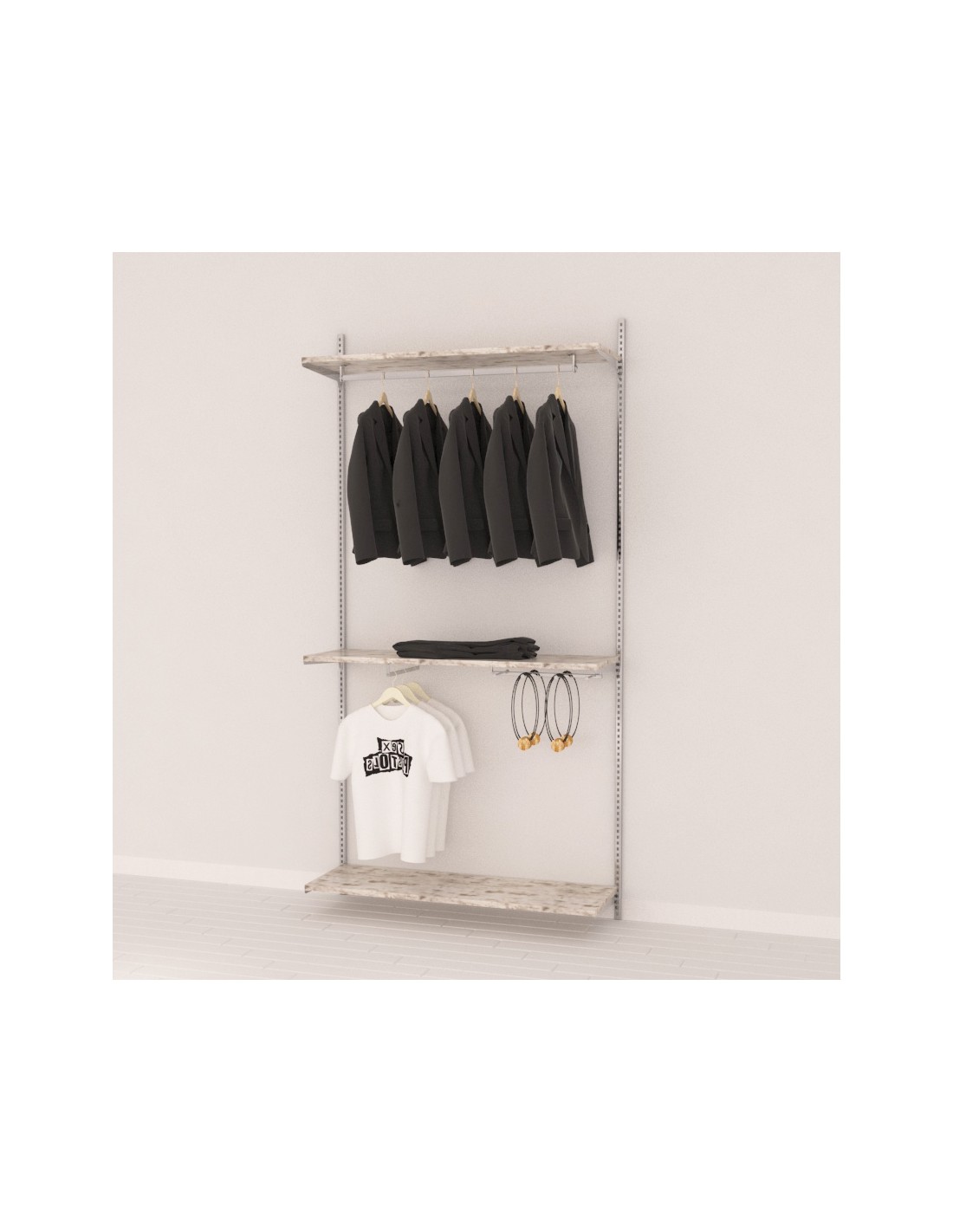 Misura Totale da 125 cm : Altezza 240 cm Passo 50 mm DOPPIA ASOLA 1APPENDERIE Materiale METALLO Finitura: CROMATO Misure: 3 RIPIANI DA 120 cm Finitura: VINTAGE Misure: Larghezza 120 cm Profondità 40 cm 1 SOTTOAPPENDERIE DA 94,5 cm 1 SOTTOAPPENDERIE FRONTALE DA 34,5 cm 1 SOTTOAPPENDERIE PER ACCESSORI DA 64,5 cm